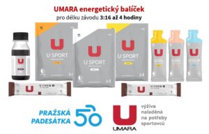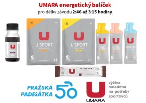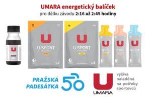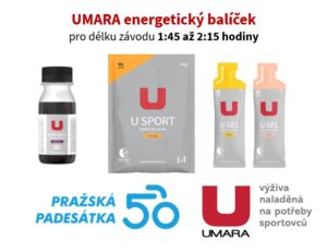 Pražská 50 se jede na trati 50 kilometrů, přesto můžete v cíli závodu pozorovat dojíždějící cyklisty několik hodin. Může za to poměrně členitá náročná trať, která důkladně prověří přípravu organizmu a také to, kolik energie budou mít na trati k dispozici. Je obecně známé, že potřebné množství energie se u sportovců odvíjí podle délky trvání výkonu. Proto pro vás výživový partner závodu, sportovní výživa UMARA, připravil 4 balíčky základní formy energie, rozdílné podle délky trvání výkonu.